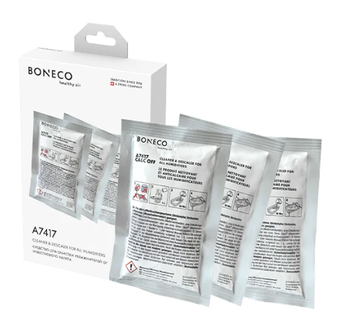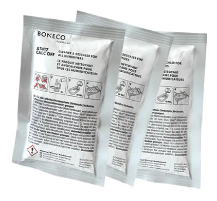 Boneco A7417 Calc-off is een reinigings- en ontkalkingsmiddel in poedervorm. Geschikt voor het verwijderen van kalkaanslag in luchtbevochtigers van Boneco en Air-o-Swiss. Inhoud van één doosje Calc-off is 3 zakjes. Door het gebruik van kalkhoudend water in een luchtbevochtiger, vindt afzetting van kalk op oppervlakten plaats. Deze kalk zal na 2 tot 3 maanden - afhankelijk van de intensiteit van gebruik en hardheid water - moeten worden verwijderd om schade aan de luchtbevochtiger te voorkomen.