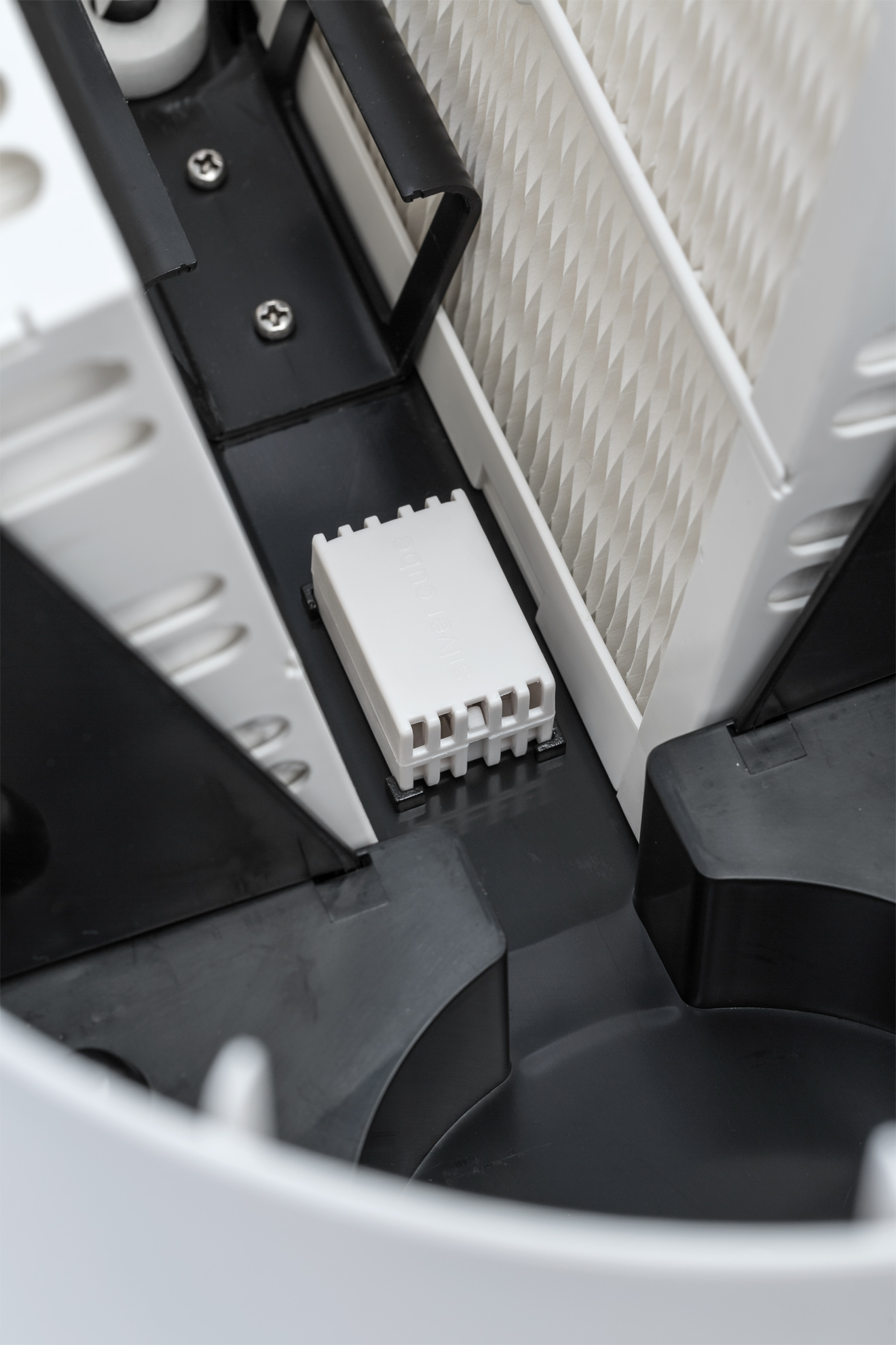 Deze bevochtiger is zeer geschikt voor grotere kamer zoals, een woonkamer of een grote slaapkamer tot 50 m2 en heeft een bevochtigingscapaciteit van 0.35 liter / uur. Het waterreservoir heeft een inhoud van 5,2 liter. Kleine deeltjes die in de lucht zweven, zoals stof of pollen, worden verwijderd. De Stylies Mira bevochtigd de lucht op een natuurlijke manier, namelijk door koud water verdamping. De bevochtiger is voorzien van een digitale hygrostaat en een LED lampje voor wanneer het waterreservoir leeg is. Hiernaast is de snelheid van de verdamping te regelen met 3 standen. Elke 2 tot 3 maanden dient het anti-bacteriële verdampingsfilter vervangen te worden voor een goede en hygiënische bevochtiging. De groei van bacteriën en ziektekiemen wordt voorkomen door de meegeleverde Ionic Silver Cube. Deze cube scheidt continu zilverionen af aan het water. Dit zorgt voor een hygiënisch binnenklimaat. De levensduur van de Ionic Silver Cube is 1 jaar bij continu verbruik. Zodra de cube in contact komt water werkt deze, ook al staat de bevochtiger niet aan. Het toerental van de ventilator wordt automatisch afgestemd op de vochtigheid in de omgeving wanneer het systeem in de stand ‘Auto Mode’ wordt gezet. Wanneer de vochtigheid hoger is dan 45%, staat de ventilatorsnelheid “0”, Wanneer de vochtigheid tussen de 40% en 45% ligt, staat de ventilatorsnelheid op de laagste stand (1), Wanneer de vochtigeid tussen de 30% en 40% ligt, staat de ventilatorsnelheid op de middelste stand (2) en Wanneer de vochtigheid lager is dan 30% staat de ventilatorsnelheid op de hoogste stand (3). Wanneer het apparaat in de stand ‘Sleep Mode’ wordt ingesteld, wordt de gewenste vochtigheid automatisch ingesteld op 45%, wordt het LCD scherm gedimd en staat de ventilatorsnelheid ingesteld op de laagste stand. De ventilator stopt als de vochtigheid bereikt is, het display toont dan ook de actuele vochtigheidswaarde. Wanneer dit het geval is zal de ventilator 2 minuten lopen op de laagste stand, een keer in de 30 minuten. Zo controleert het systeem of de vochtigheid gedaald is. Wanneer de vochtigheid gedaald is, onder de ingestelde waarde, schakelt het systeem zichzelf weer automatisch aan. Deze eye catcher bevochtigd uw kamer of ruimte snel en gemakkelijk.