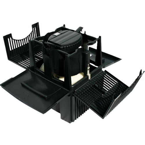 Binnenin het apparaat draait een schijvenstapel langzaam rond in een waterreservoir van ca. 5 liter. Terwijl de schijven draaien, verdampt zuiver water langzaam in de lucht. Hierdoor ontstaat een gelijkmatige en aangename luchtvochtigheid – volledig zonder zichtbare nevel, zonder kalkafzetting in de ruimte en zonder stofvorming. Dit verdampingsprincipe helpt tegelijkertijd om ongewenste deeltjes uit de lucht te reduceren, zoals stofdeeltjes en pollen die zich in het water hechten.